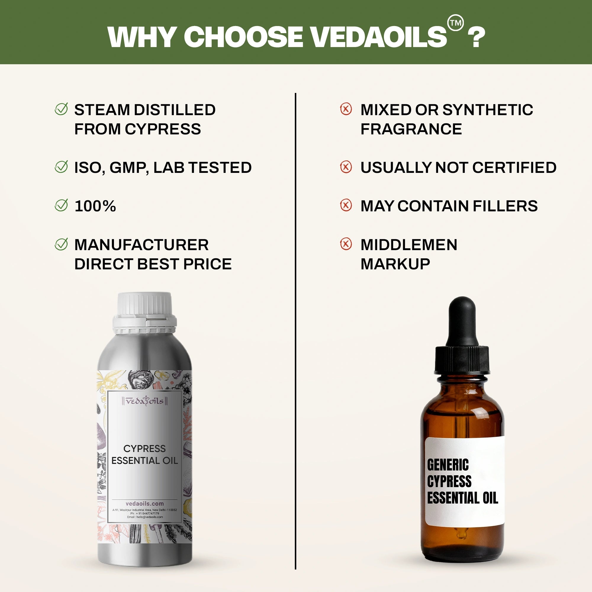 VedaOils is one of the leading Best Cypress Oil Wholesale Supplier, Manufacturer & Exporter of India & Worldwide. We ensure that all our Cypress Oil adhere to the highest Purity standards & Quality. We offer the purest forms of Cypress Oil essential oils to our customers without chemicals, additives, or fillers. They also do not contain any artificial colors, preservatives,and fragrances. Therefore, they prove to be ideal for daily use. You can order Cypress Oil in Bulk Quantity directly from wholesale supplier in India. Cypress Oil is for your daily purposes such as dark circles, skin lightening, hair growth, arthritis, digestion, and better oral health. Check out the cypress oil price per Kg, even you can purchase Cypress Oil essential oil in bulk quantity at Wholesale rate. Order Certified Cypress Oil from our safe and secure payment gateway to safeguard your transactions. You can purchase cypress oil online for your daily purposes. You can also order cypress oil essentials online in bulk quality. We also export this oil around the globe including the UK, Australia, USA, Canada, and other countries. We also deliver products throughout the world using our logistic partners DHL, FedEx BlueDart, India Post, etc. Do not miss this wonderful opportunity to buy chemical-free, fresh, and multi-purpose Cypress Oil from VedaOils.