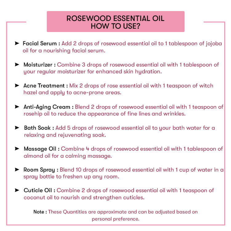 Rosewood essential oil has emerged to be one of the popular ingredients in cosmetic products. Do not contain any synthetic fragrances, colors, and preservatives. You can include it in your regular skincare routine without any doubts. Rosewood Essential oils easily blend well with many other essential oils belonging to the wood and floral family. However, do not forget to do a patch test on your elbow to check whether it suits your skin or not, especially after blending it with other concentrated oils.