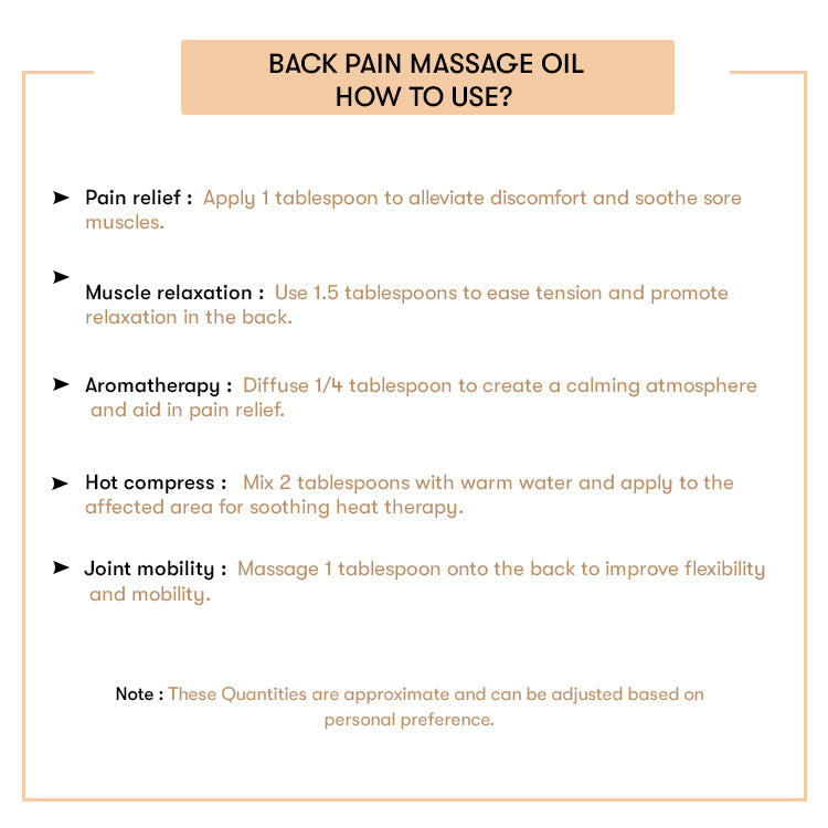 How to Use: Slightly warm the back pain massage oil and massage well on the back, shoulder, hips, and other parts of the body. Leave the oil on the body for fifteen to twenty minutes and follow with a warm bath.