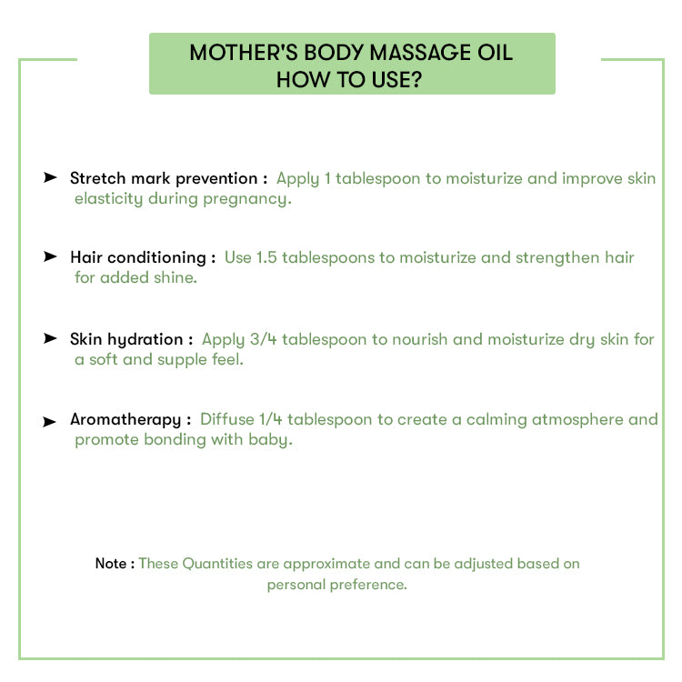 Mother's Body Massage oil contains high-quality Mustard oil, Sesame oil, Coconut oil, Sweet Almond oil, Turmeric oil, and Olive oil. Biologically active compounds present in this massage oil are great for rejuvenating tired muscles. A full-body massage using this oil eases pain from your body and relaxes your body after delivery. It also eases the stress from the mother's body after giving birth.