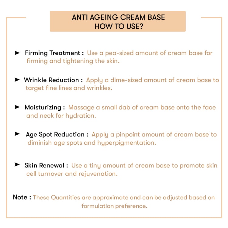 Anti-ageing cream base is a blend of numerous ingredients that love your skin and enhance your self-care routine. Wrinkles are a major factor contributing to old and saggy skin making us appear older than we are. Anti-ageing cream reduces the appearance of wrinkles and hyperpigmentation to a significant extent and adds more elasticity for firm and supple skin..