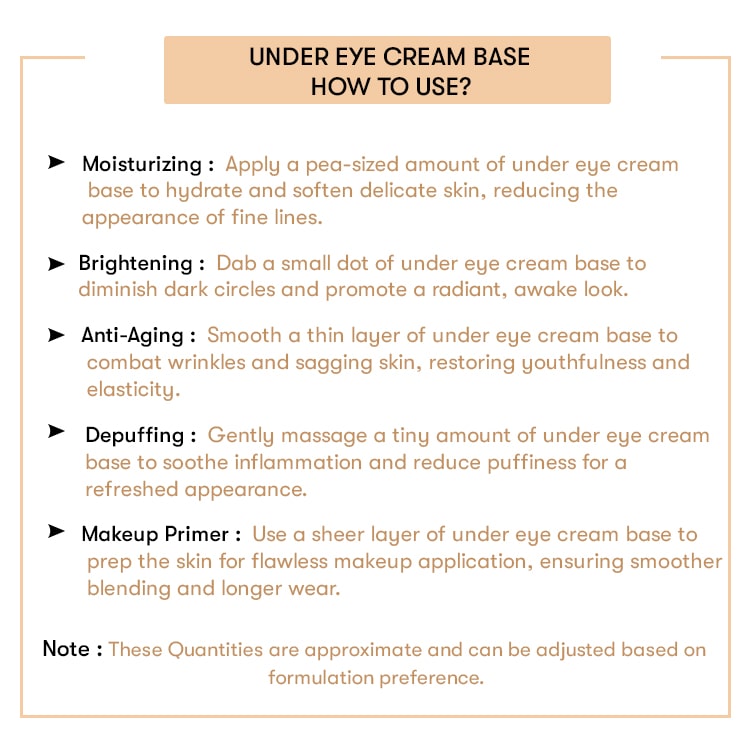 Under eye cream base is curated to increase the hydration under the eye, and cell regeneration while reducing dark circles. It significantly boosts collagen production which is a protein that promotes a youthful and wrinkle-free appearance. As we age our body naturally tends to produce less and less collagen forming more fine lines and wrinkles.