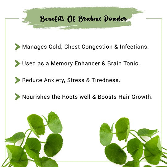 Brahmi, scientifically known as Bacopa Monieri and botanically as Centella Asiatica, is a miracle herb that boosts memory and cognition. Natural Brahmi Herbal Powder also reduces behavioral changes and protects against oxidative damage. Brahmi protects hair and skin from oxidative damage, promoting skin cell renewal and hair growth.