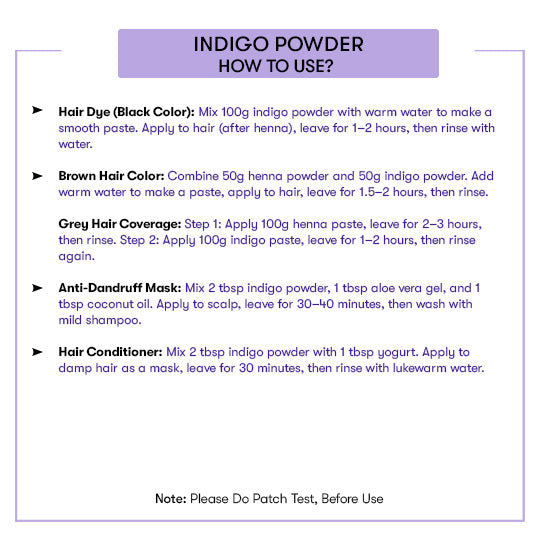 Made from Indigo plants, our Indigo Powder is organic and free from artificial colors and preservatives. It is completely natural and is mostly used for hair dying purposes. It can also be mixed with Henna Powder to give a darker tint to your hair. Since ancient times, the Natural Indigo Leaf Powder has been used to hide grey hair and hair growth since it has a pigment of deep blue color that darkens your hair naturally.