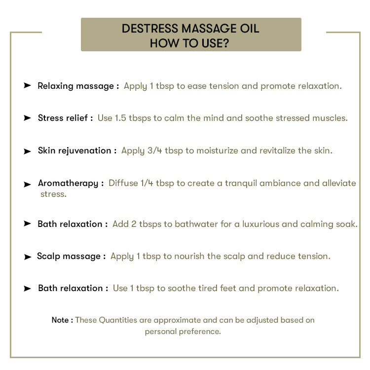 How to Use: Take a few drops of DeStress Body massage oil and apply it all over your body. Gently massage the body in a circular motion for 25-30 minutes. Leave it on for at least 30 mins so that nutrients can absorb deeply into the skin.