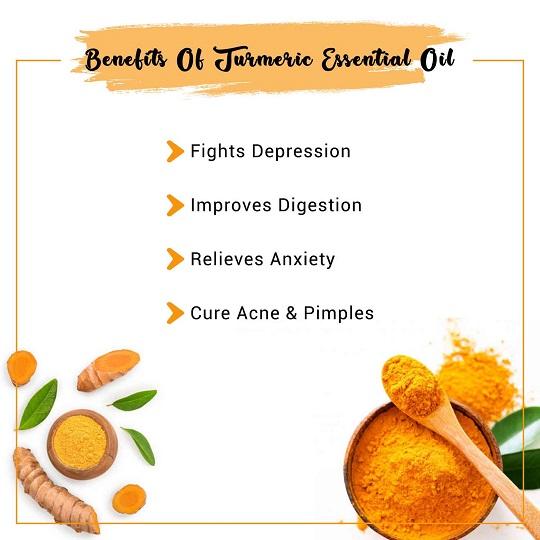 The strong antibacterial properties of turmeric essential oil make it an ideal remedy for curing wounds and cuts. It also can stop bleeding and prevents the wounds from getting septic as it possesses antiseptic properties. Turmeric oil used in many skincare and beauty care products because it contains antioxidants that are powerful enough to protect your skin.