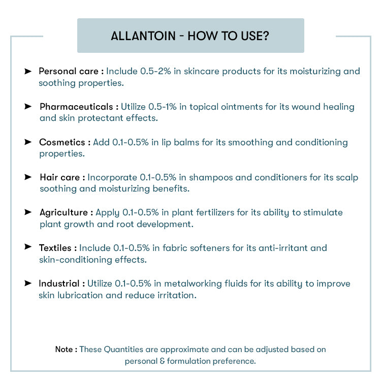 Allantoin, also known as aluminum dihydroxy allantoinate, is a diureide of glyoxylic acid that is produced from uric acid. It is a result of major metabolic activity in most organisms. It is also found as a normal component of human diets. Natural Allantoin Powder is a non-irritating ingredient that soothes and protects the skin from damage due to chemicals, pollution, toxins, and free radicals. Its skin-calming effects are used for sensitive and skin-friendly products. Allantoin has skin whitening properties and helpful in removing acne scars.