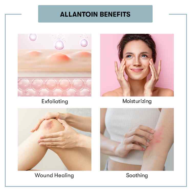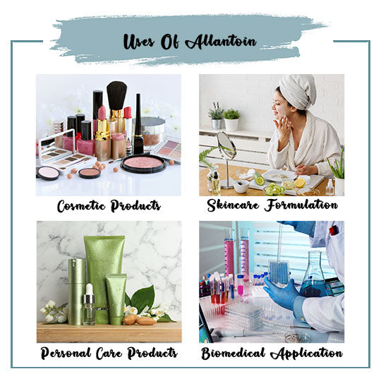 Allantoin powder prevents transepidermal water loss(TEWL) from the skin which helps to retain water in the skin cells. Moreover, it helps in cell proliferation, which means that it helps to exfoliate the dead skin cells and regenerate newer and healthier skin cells resulting in better-looking skin. Allantoin is quite a popular ingredient in OTC cosmetic and pharmaceutical products such as oral hygiene products and cell-repair ointments.