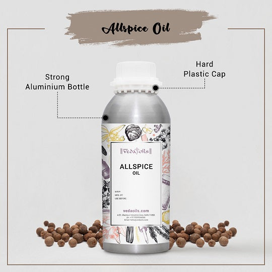 VedaOils provides pure and natural AllSpice Oil, which is used widely in cosmetic products due to its antifungal, antiseptic, and antibacterial properties. No artificial preservatives and synthetic ingredients are used for making it, which makes it safe for everyone.