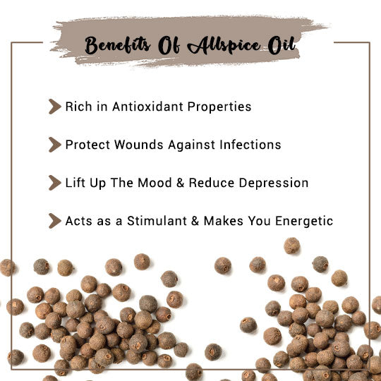 Devoid of any harmful preservatives, additives or chemicals, our Allspice Oil is 100% pure and safe to use in topical and aromatherapy applications. This oil contains aromatic compounds such as limonene, alpha-terpinene, eugenol, alpha-pinene, etc., that give it anti-inflammatory properties. These compounds also contain powerful antioxidants that help you to use them for skin and hair care purposes.