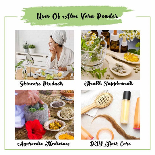Natural Aloe Vera powder dissolves in water completely and its solution absorbs skin quickly. Hydrating properties of Aloe Vera powder solution keep your skin moisturized for a long time. Also, it helps you to get rid of dry, chapped, and sensitive skin by massaging it regularly on the affected areas.