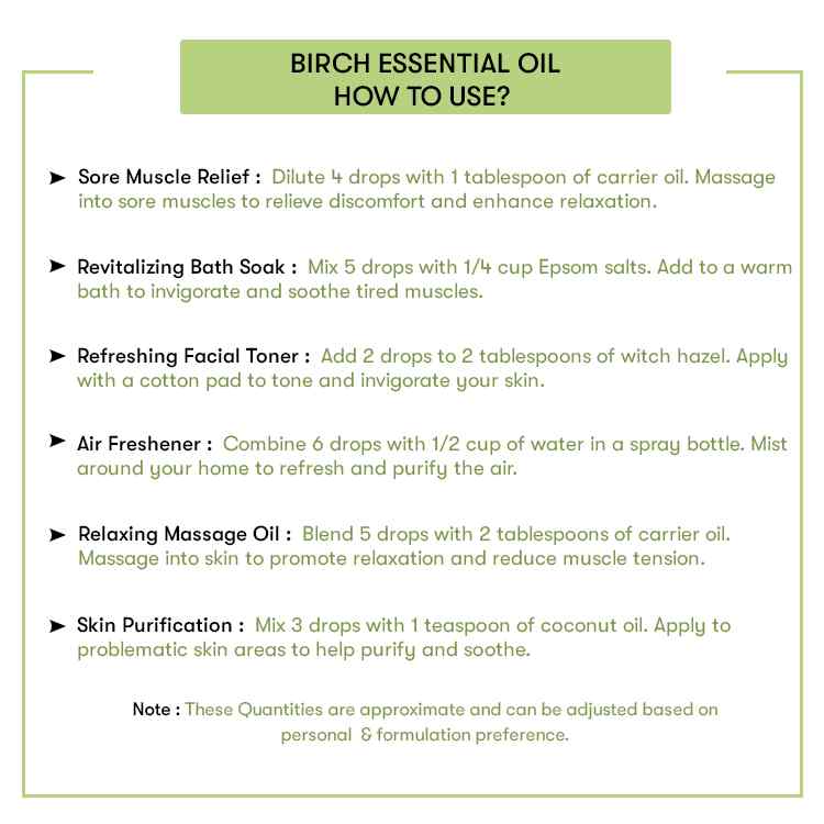 A: The Birch essential oil is used to heal muscle pain, skin diseases, hair loss, and improves blood circulation, etc.