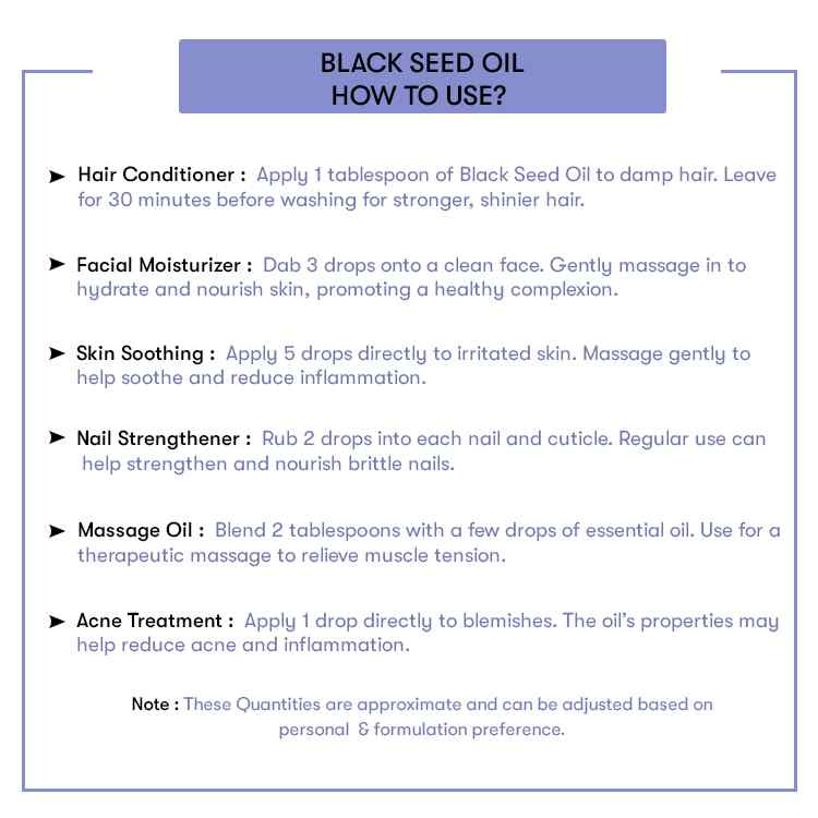 The oil obtained by cold-pressing the Black Seeds (Nigella Sativa) is known as Black Seed Oil. Apart from culinary preparations, it is also used in cosmetic applications due to its nourishing properties. You can also use Black seed oil to add a unique flavor to your pickles, curries, and other food items. However, do not add too much as it is a concentrated oil.