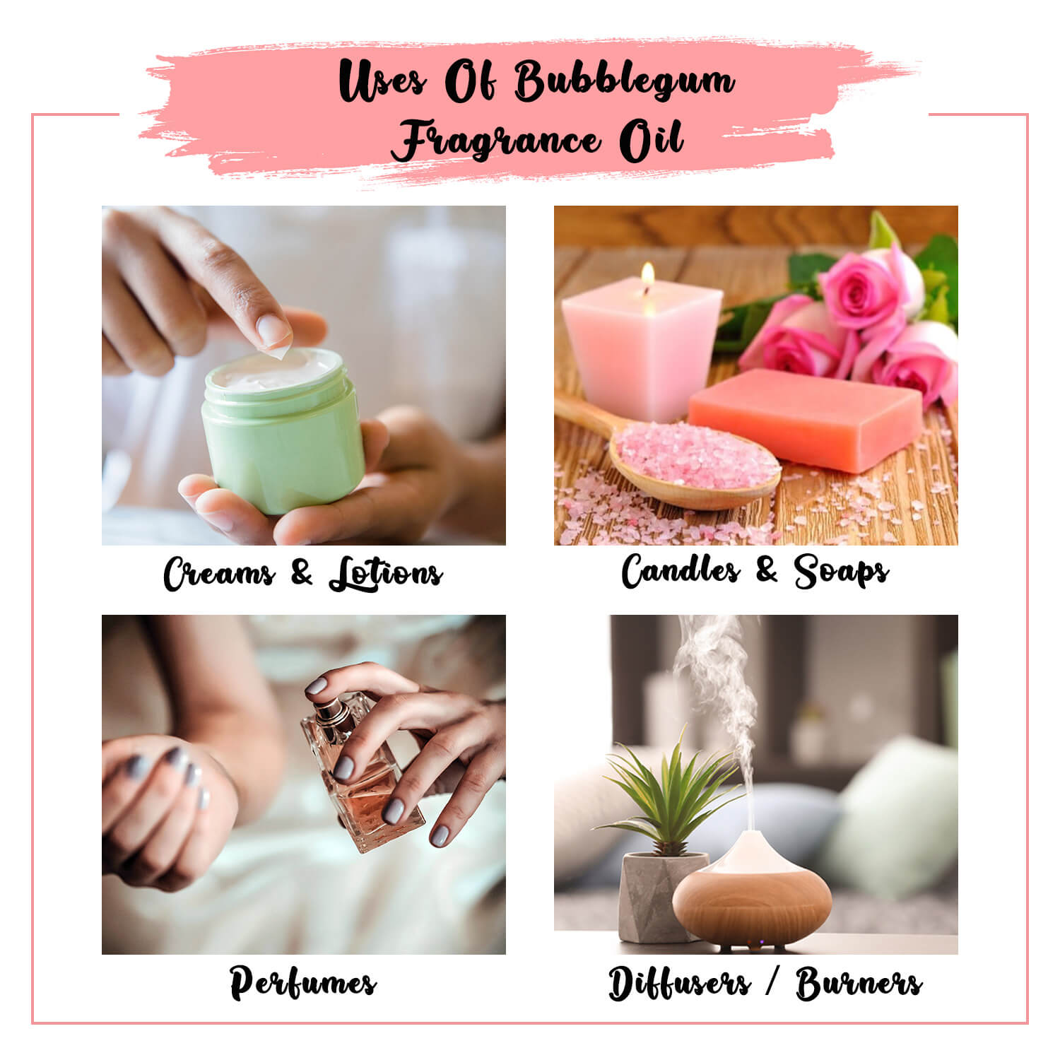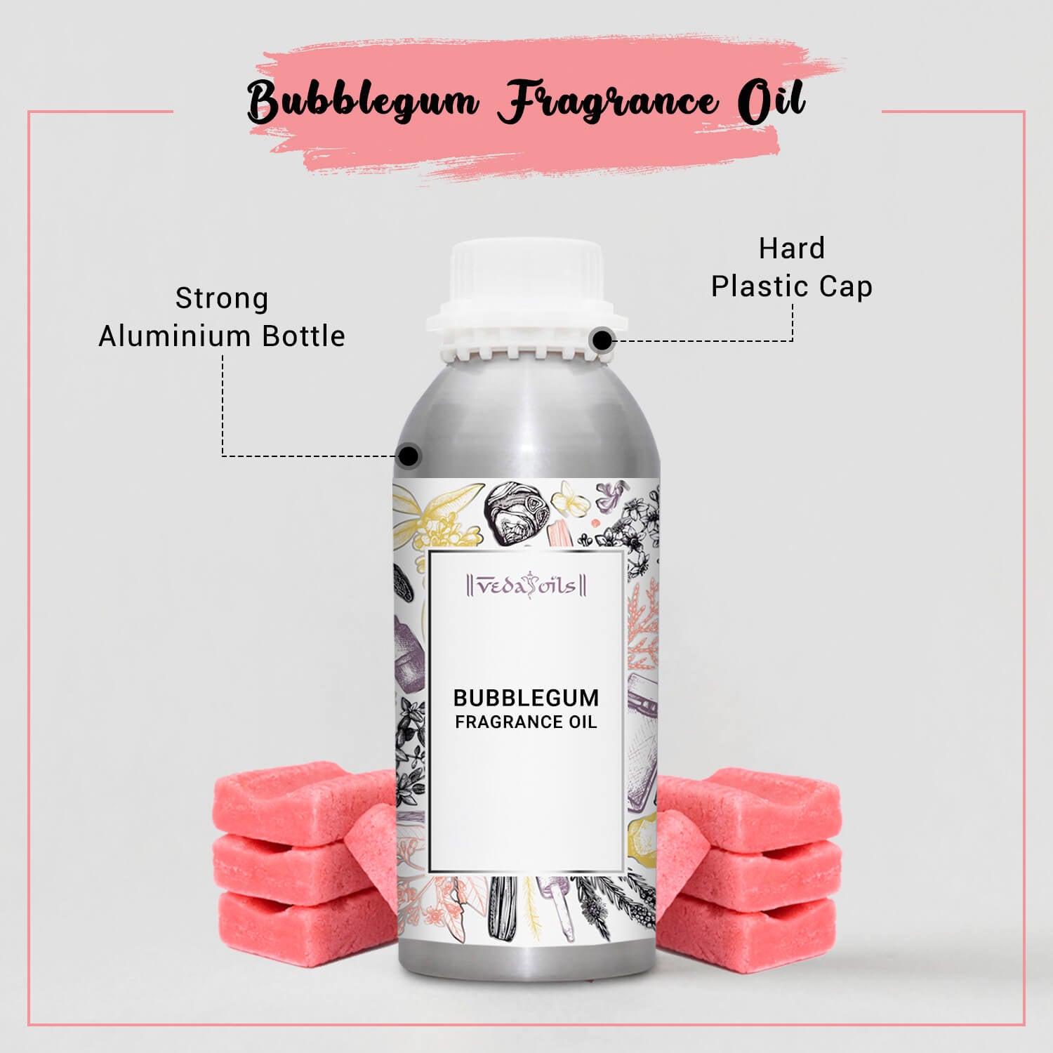 - Scented Candle: Scented candles with Calm and comforting aromas are made using Fragrance oil in a calculated quantity. You can use 15 ml of Bubble Gum Oil for 250 grams candle wax flakes to obtain a perfect smelling scented candles. Make sure you measure your quantities correctly so that the fragrance doesn't get overpowered.