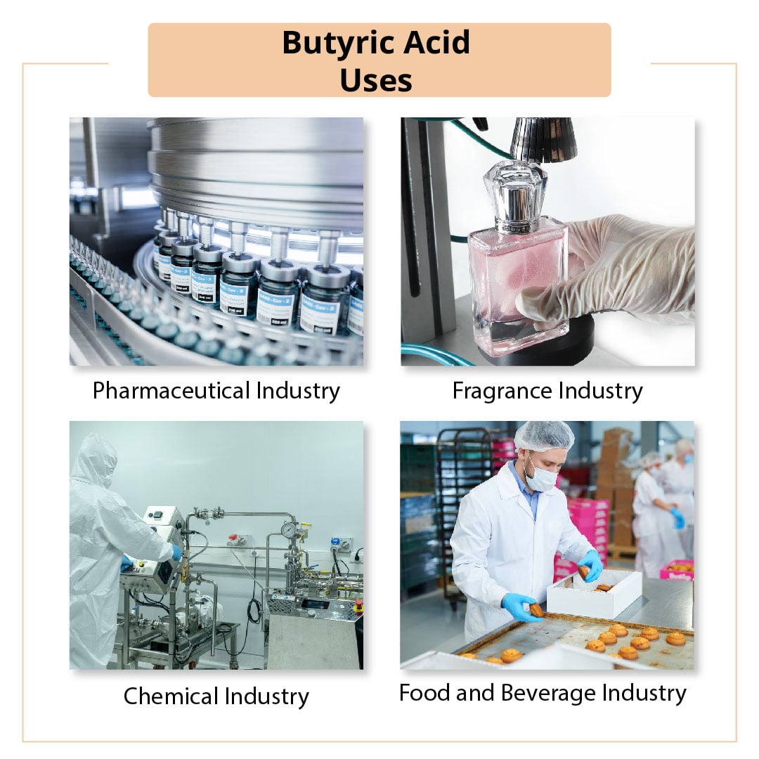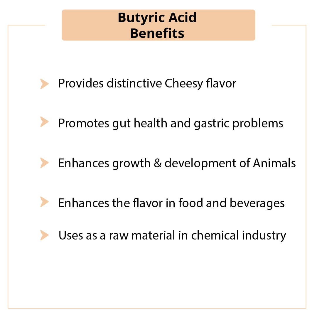 It imparts a distinctive, buttery taste to various foods and is often found in products such as butter, cheese, and certain fruit-flavored beverages. In summary, butyric acid is a versatile compound with industrial applications, physiological significance in gut health, and a role as a flavoring agent in the food industry. Its multifaceted nature and unique properties make it an essential component in several sectors.