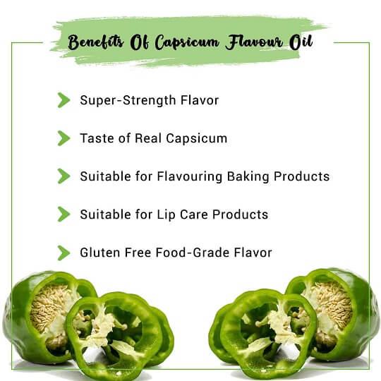 Capsicum flavor oil is a highly concentrated and volatile formulation of the pungently scented, capsaicin-rich product. Made from fresh and natural capsicum, the Capsicum Flavour Oil will add a spicy and intense flavor to your dishes and sauces. You can add this flavor oil in your food items like capsicum toast, pizza, curry, capsicum stuffed omelets, chocolates, and many more.
