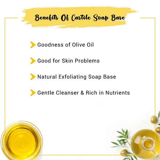 Castile Soap Base is derived from the natural oils present in olive. Soaps made from Castile Melt and Soap Pour Soap Base contain lye which helps to catch dirt and impurities from the skin. The oil present in the soap base help to provide soap with nourishing, lathering, Moisturizing, and Cleansing properties.