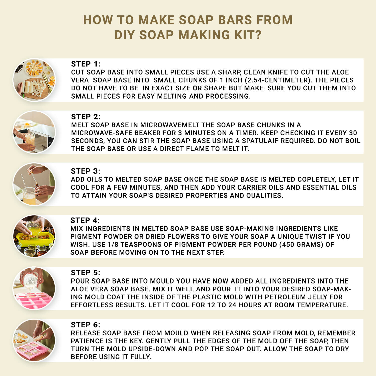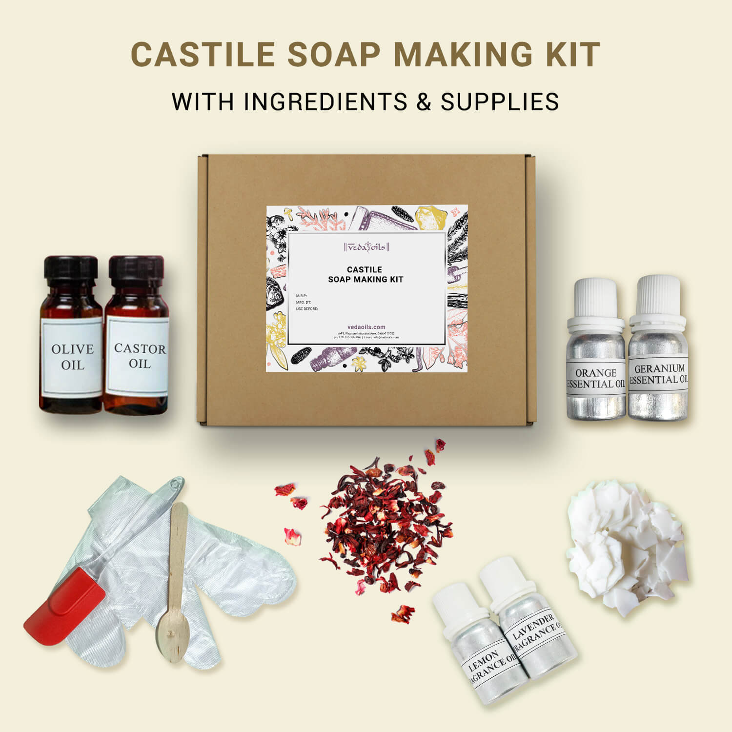 - Equipment: With our DIY Castile Soap Bar Making Kit, you'll experience a safe soap-making process since we provide equipment and supplies that keep your hands clean during the process.