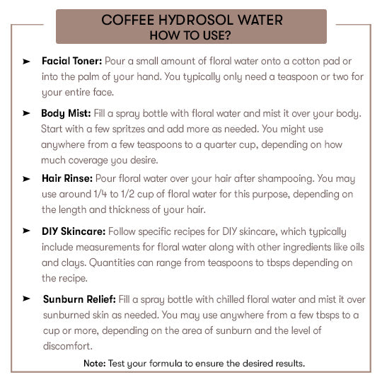 Coffee ingredients are currently undergoing studies for their topical benefits in cosmetics. Many believe that adding coffee derived extracts provide temporary skin tightening & toning benefits. Most wraps and creams targeted for cellulite issues contain some form of coffee. You can use this floral water directly on your skin as a toner, or you can add it as a replacement for the water content in any beauty care recipe.