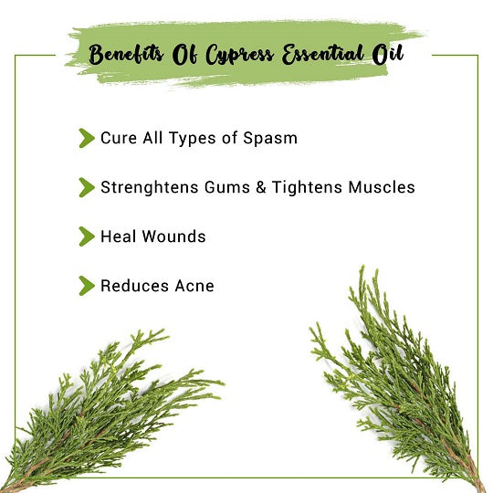 Organic Cypress Essential Oil exhibits Antibacterial and Antiseptic properties. Also, as it does not contain any chemicals or fillers, you can use it for topical application without any worries. It also supports breathing and possesses Antispasmodic properties. Cypress essential oil also stimulates urination that may help to lose some of the unwanted fat from your body.