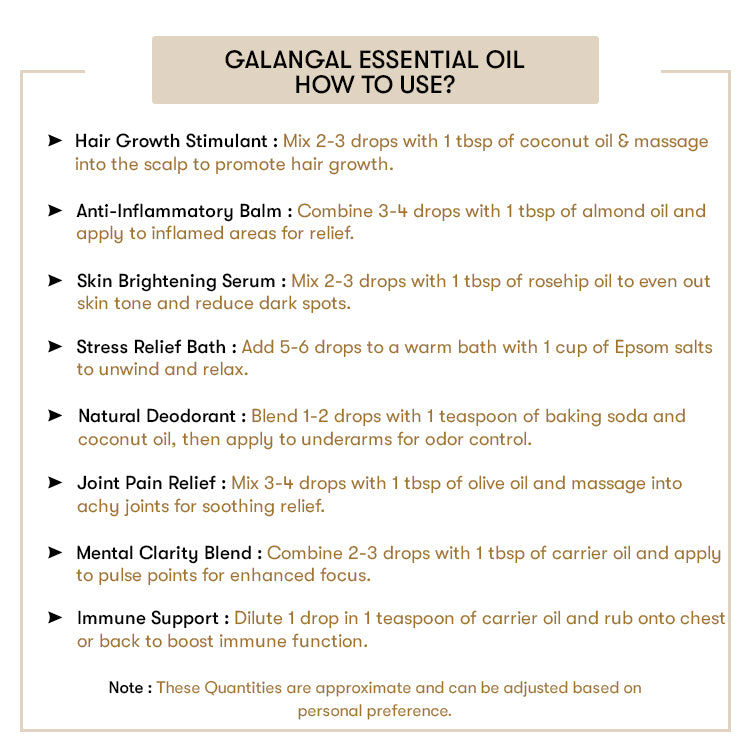 A: Cardamom, Ginger, Geranium, Cypress, and Black Pepper essential oils blend well with Galangal Essential Oil.