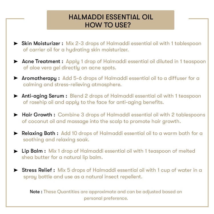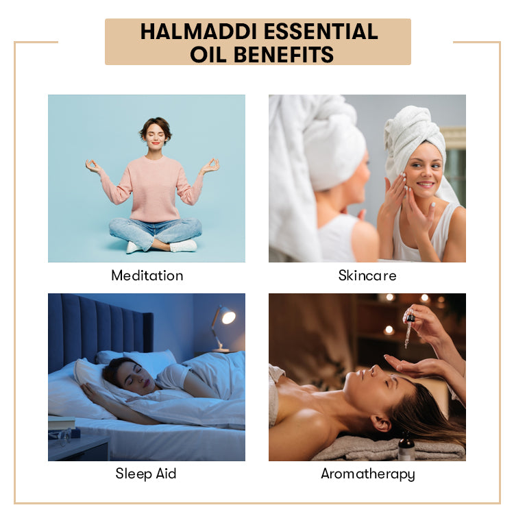 A: Halmaddi Essential Oil is used for aromatherapy, haircare, skincare, and meditation purposes.