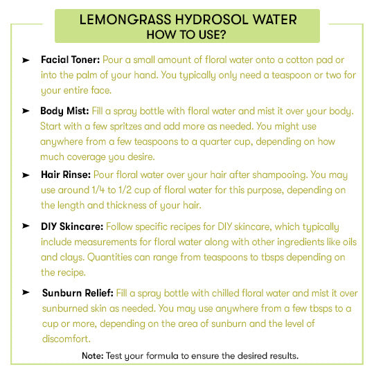 Lemongrass Hydrosol can be incorporated in bath care products and massage creams as it helps to banish pain from your muscles and joints. Overall, it is a great ingredient for personal care and skincare products. You may also incorporate Lemongrass Water in hair care products due to its fresh and inviting aroma.