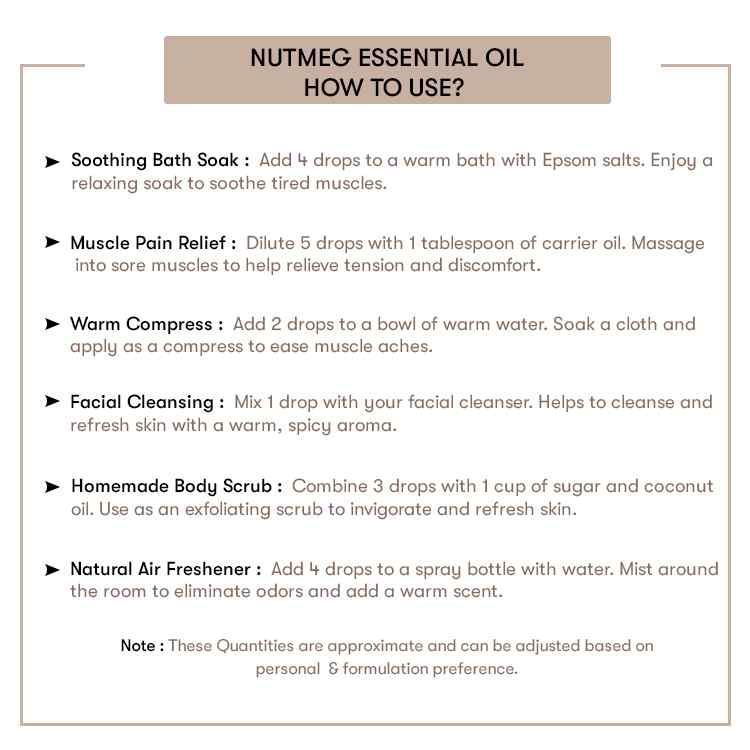 Regular use of our pure Nutmeg essential oil in your hair care and beauty care regimen will enhance the overall health of your hair and skin. It also possesses stimulant properties and is considered to be a natural aphrodisiac as well when diffused in bedroom. Therefore, it is a cool thing to have this essential oil in your collection.