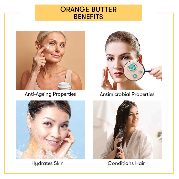 Orange Body Butter is prepared from goodness and richness of actual orange fruity pulps and is essentially rich in Vitamin C, Vitamin D, Vitamin B6, Cobalamin, Magnesium, Iron, Calcium, fiber and numerous other minerals along with a high amount of potassium and sodium. This product possesses miraculously high antioxidant and antimicrobial properties which combat free radicals. Organic Sweet Orange Body Butter also contains tiny amounts of saturated fats which help in hydrating, nourishing, and moisturizing your skin.
