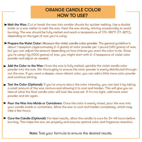 Orange Candle Color, earlier referred as ultramarine Orange, is a pigment powder pure in form and is used popularly as a colourant in the cold process candle making activity. When used in candle making, as major pigmenting powder, gives your candles a bright, natural and a brilliant Orange colour. This product can be used to add colour to a product, the colour of which may range from matte light pastel Orange (matte baby Orange colour) to a very deep, matte, dark intense Orange (prussian Orange colour).