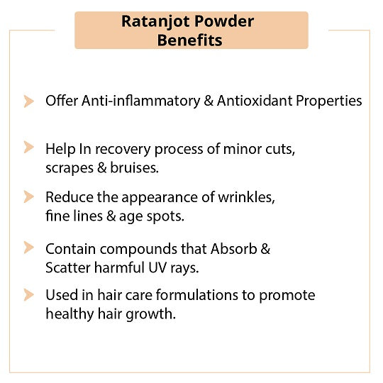 In traditional medicine, Ratanjot powder is known for its anti-inflammatory, antimicrobial, and antioxidant effects. It is often used topically to soothe skin irritations, heal wounds, and promote overall skin health. It is also used in the preparation of herbal remedies for conditions such as arthritis, respiratory disorders, and digestive issues.