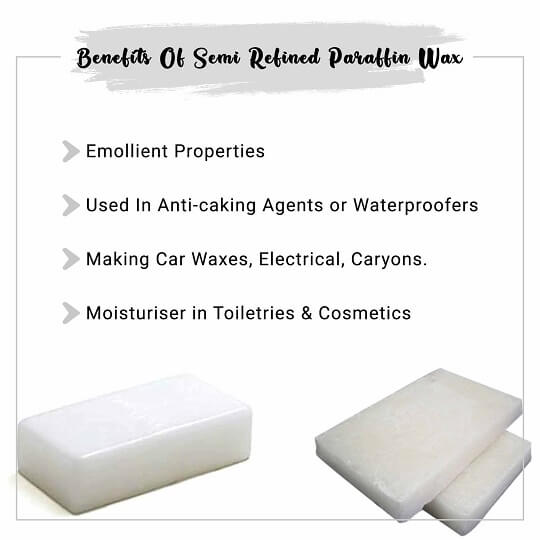 Paraffin Wax is made from a combination of hydrocarbon molecules. It is usually available in the form of slabs or bricks of a white and off-white color. Semi Refined Paraffin Wax is a form of Paraffin Wax that contains different amounts of oil. It helps to increase the viscosity of products and regulate their consistency.