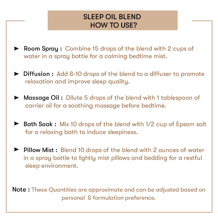 This Versatile Oil Blend will prepare you for sleep and create a sense of mind-body harmony. With this Essential Oil Blend, you can create a calming environment and promote restful thoughts in the midst of your busy day.This oil blend is made from high-quality Lavender, Chamomile, Cedarwood, Bergamot, Frankincense, Orange, Sandalwood and Patchouli Essential Oils that are known for their natural sleep-inducing effects. These oils have been used traditionally to promote a restful night's sleep because of their ability to relax the mind and body and reduce stress. Get the rest you require with this calming essential oil blend, which is designed to help your body relax into a deep and blissful sleep.