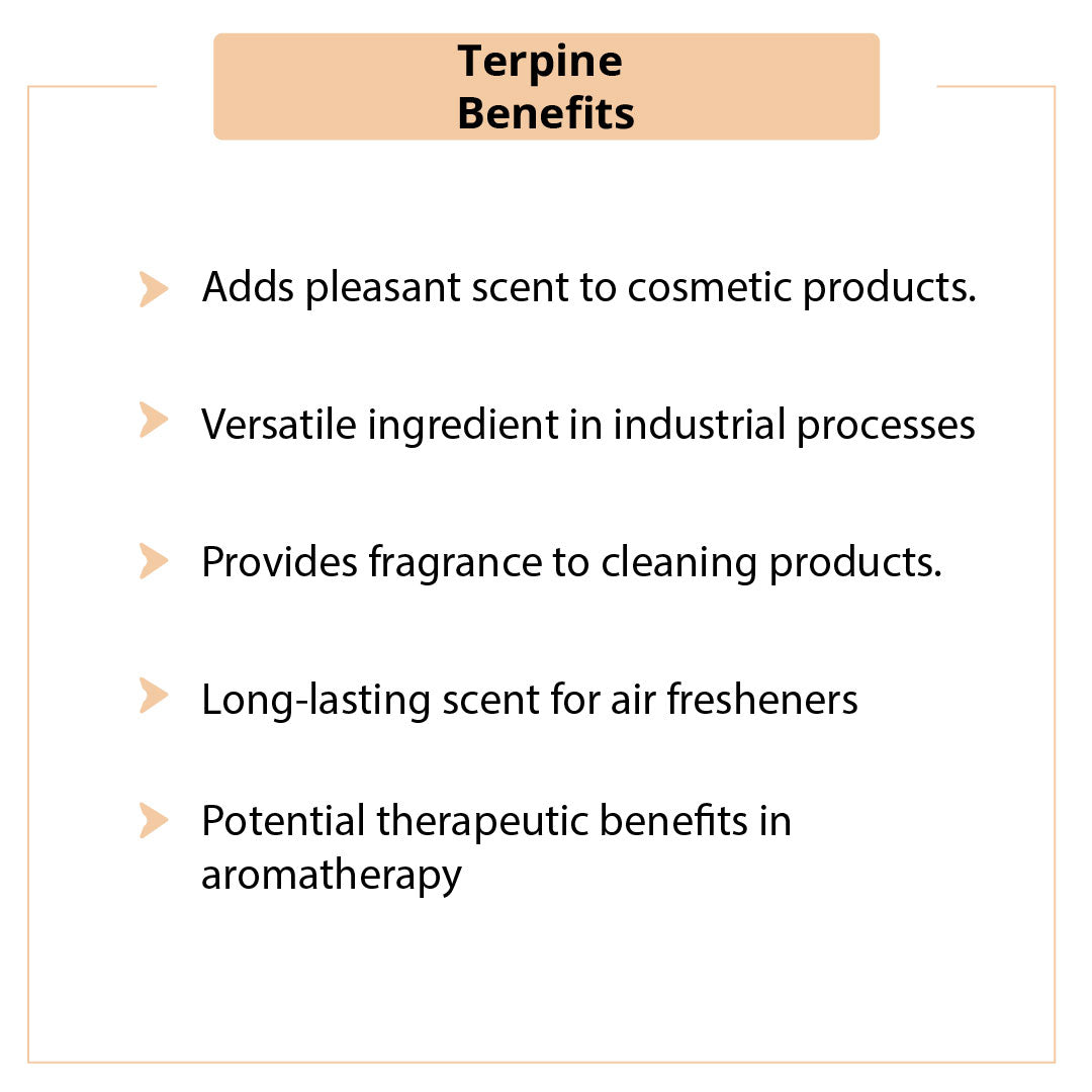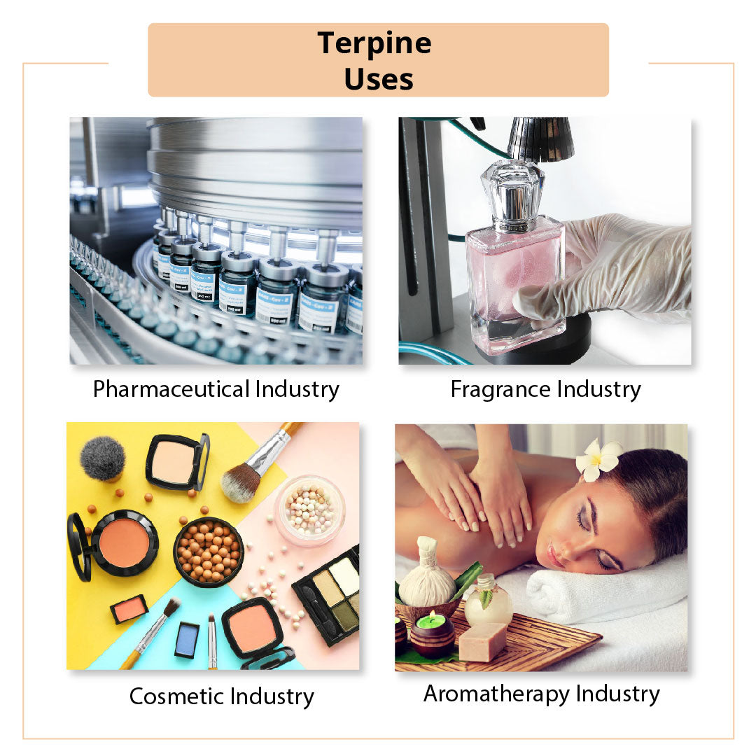 Terpine perfumery grade is highly valued for its ability to evoke nature-inspired fragrances. It blends well with other fragrance ingredients, enhancing their aromatic profiles and creating harmonious compositions. The compound's versatility allows it to be used in a wide range of fragrance creations, from fresh and airy scents to warm and woody ones.