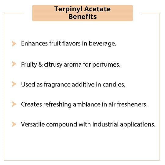 Moreover, it holds potential therapeutic value, with its aroma believed to evoke relaxation and stress relief in aromatherapy. As a compound of diverse aromatic and functional qualities, Terpinyl Acetate emerges as a valuable component in both sensory experiences and holistic well-being practices.