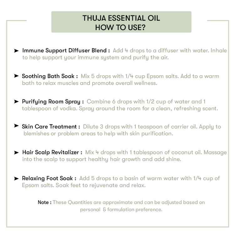 Arborvitae essential oil possesses astringent properties and is also suitable for aromatherapy due to its soothing scent. Makers of soaps and cosmetic applications prefer it as a fragrance enhancer in their products. Due to its nourishing and skin-friendly qualities, it is incorporated into daily skincare and face care regimes. It is included in oriental medicine for hair care purposes. People suffering from respiratory and throat infections can get instant relief by inhaling vapors of Organic Thuja Oil.