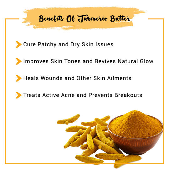 Usage of turmeric butter gives your skin youthful and energized vibrancy with rich medicinal extracts of natural, organic turmeric which helps skin recover quickly from signs of ageing. It also helps in brightening skin, reducing dark spots and also, pigmentation marks, to reveal a radiant, youthful, blemish-free skin. It acts like an antioxidant rich moisturizer which boosts appearance of skin by hydrating it deeply, relieving early signs of ageing and stimulating cell growth, by curbing effects of ageing and environmental aggressors which may deplete natural radiance of your skin.